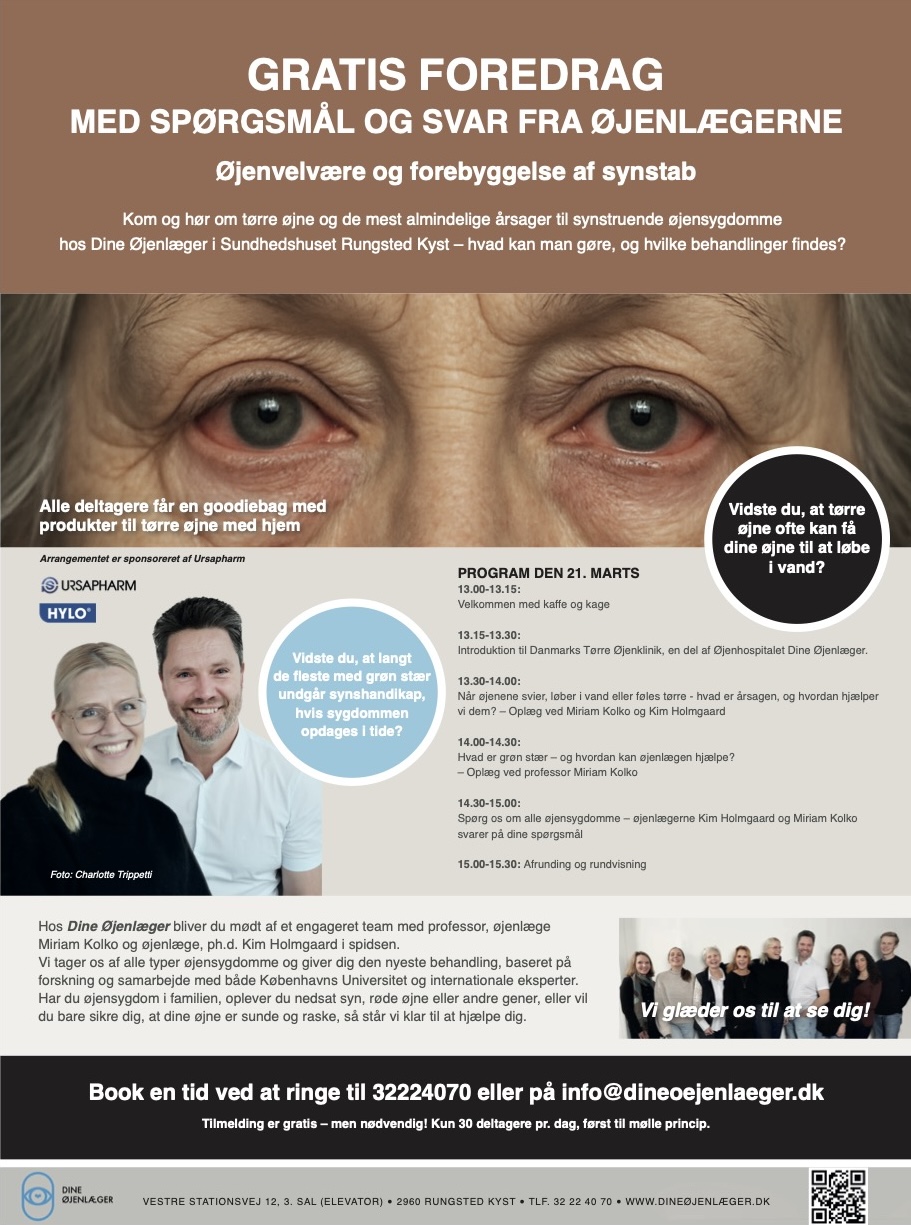 Alle events afholdes på vores klinik i Sundhedshuset, Rungsted Kyst, hvor du bliver budt velkommen af vores engagerede team med professor, øjenlæge Miriam Kolko og øjenlæge, ph.d. Kim Holmgaard.