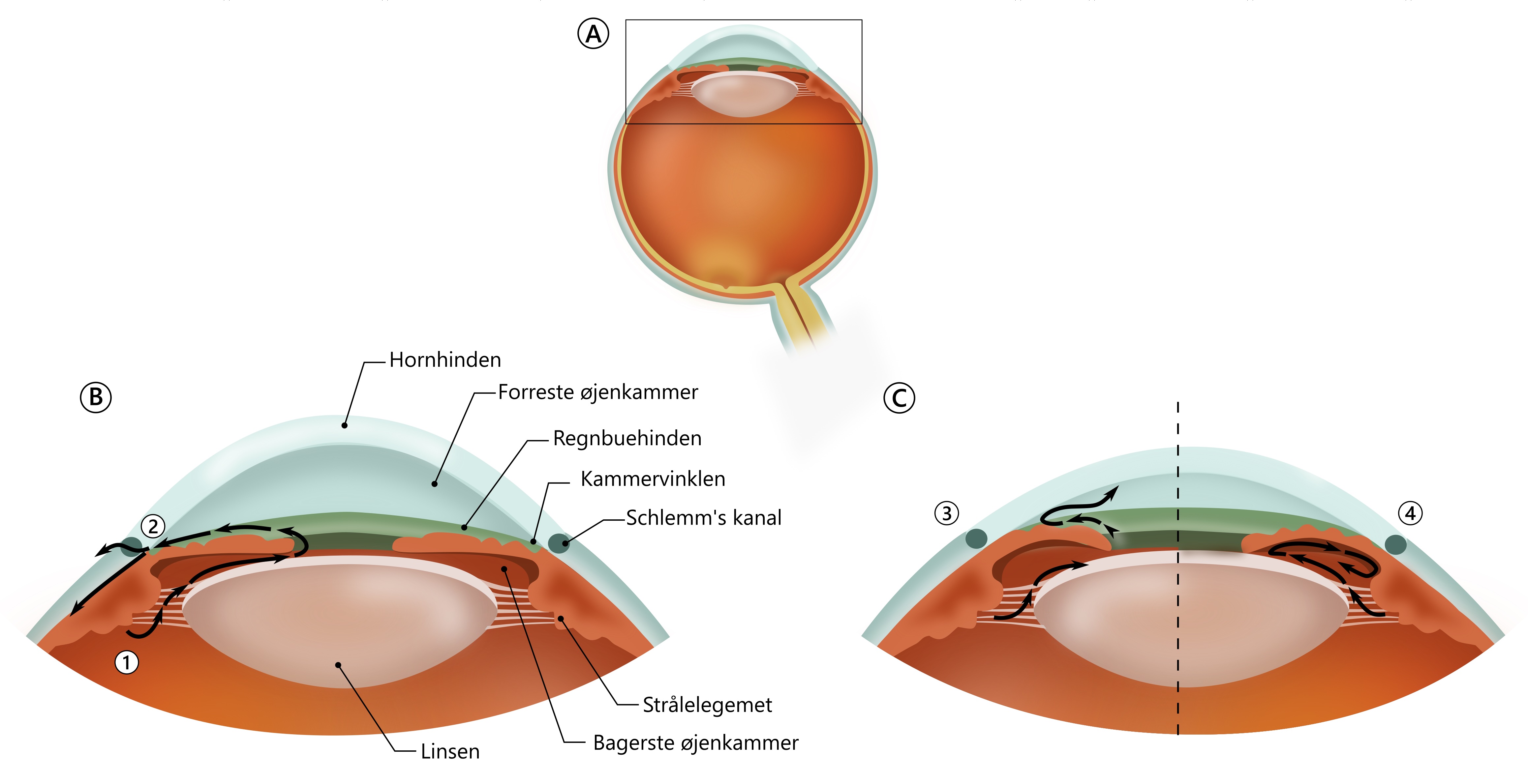 Figuren viser kammervæskens cirkulation i øjet. A: Viser en oversigt over øjet. B: Viser, hvordan væsken i øjet (kammervæsken) produceres i strålelegemet (1), strømmer gennem pupillen til det forreste øjenkammer og drænes ud af øjet via øjets indre afløb (kammervinklen og Schlemm's kanal). Denne proces er essentiel for at opretholde øjets tryk og væskebalance. C: Viser den særlige form for glaukom (lukketvinkel glaukom), hvor væsken ikke kan komme fra strålelegemet til øjets indre afløb, hvorfor øjentrykket stiger. Hvis passagen pludseligt blokeres, opstår en akut trykstigning, som kan være synstruende på kort tid og kræver øjeblikkelig behandling.