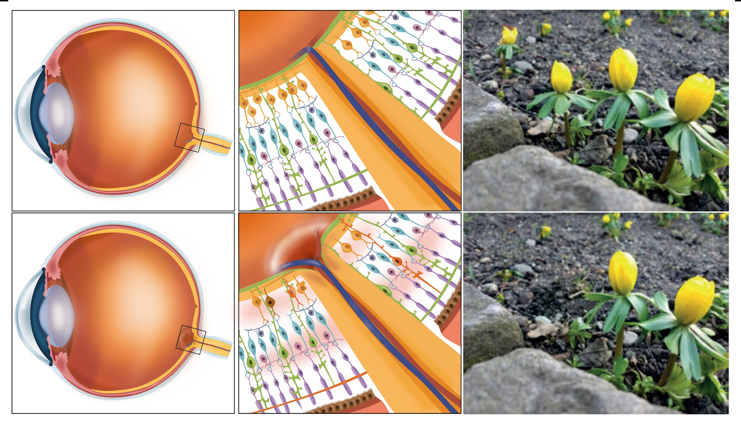 Figuren viser et sundt øje øverst og et glaukomramt øje nederst. Billederne med blomsterne viser, hvordan synstab kan forekomme ubemærket, da hjernen kompenserer ved at udfylde de manglende områder i synsfeltet. Glaukom udvikler sig gradvist og uden smerter, hvilket gør regelmæssige øjenundersøgelser afgørende for tidlig opdagelse og behandling.