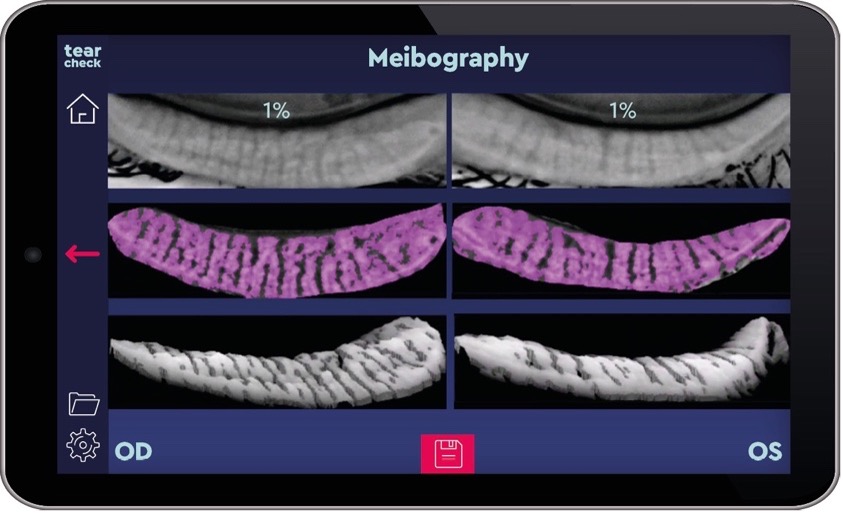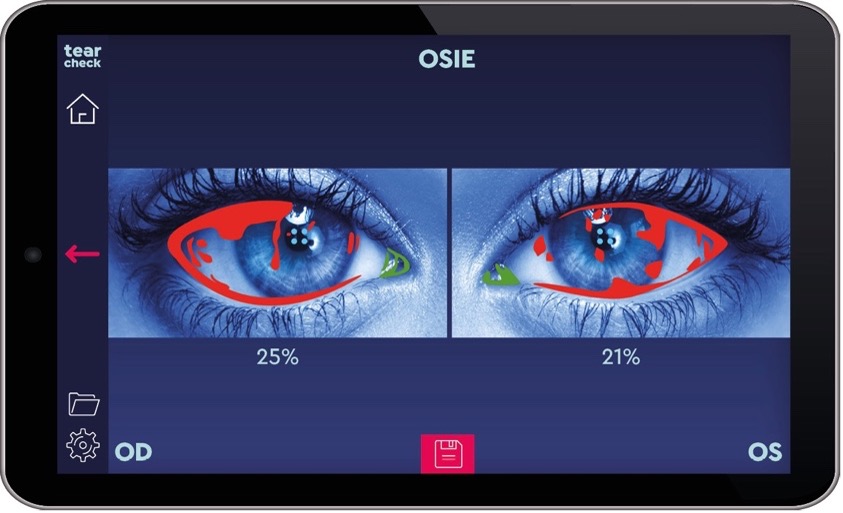 Figuren viser en tårefilmanalyse, hvor tårefilmens kvalitet undersøges. Hvis tårefilmen mangler fedtstof, bliver den kun kort tid på øjets overflade, hvorved man ikke får beskyttet øjets overflade. På billedet ses en undersøgelse af netop tårefilmens kvalitet, der kaldes non-invasive break-up time (NIBUT). En kort NIBUT viser, at tårevæsken kun bliver kort på øjets overflade, da den fordamper pga. manglende indhold af fedtstof. Det er en af de hyppigste årsager til tørre og irriterede øjne. Manglen på fedtstof skyldes ofte, at øjenlågskirtlerne, de meibomske kirtler, er tilstoppede eller mangler. God øjenvippehygiejne, behandling/fjernelse af øjenvippemider (demodex) kan hjælpe med at genoprette de meibomske kirtlers funktion og dermed forbedre tårefilmen og lindre symptomerne.