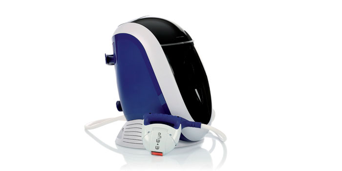 Figuren viser vores IPL-apparat, som anvendes til behandling af tørre og irriterede øjne. Behandlingen udføres ved, at der gives fem lysimpulser (IPL – Intense Pulsed Light) under hvert øje. Forløbet gentages fire gange med behandlinger på dag 0, 15, 45 og 75. De fleste patienter kan herefter vedligeholde effekten med én årlig behandling, mens nogle har behov for hyppigere opfølgning. IPL udsender pulserende infrarødt lys, som stimulerer nerverne, der styrer tåreproduktionen. Samtidig reduceres betændelsestilstanden i øjenomgivelserne, og varmen får fedtstoffet i de meibomske kirtler til at smelte, så det lettere kan indgå i tårefilmen. Endelig dræbes øjenvippemider (Demodex), som ikke tåler IPL, hvilket gør behandlingen særligt effektiv hos patienter med Demodex-relaterede gener.